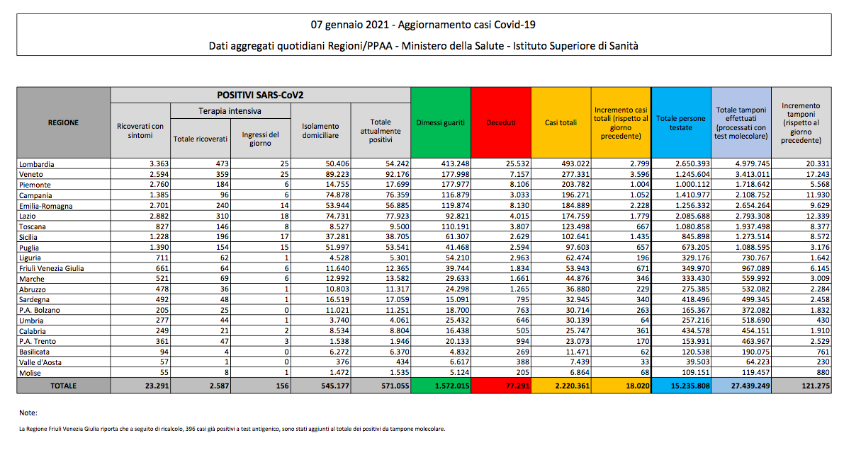 Coronavirus, Italia: il bollettino di giovedì 7 gennaio