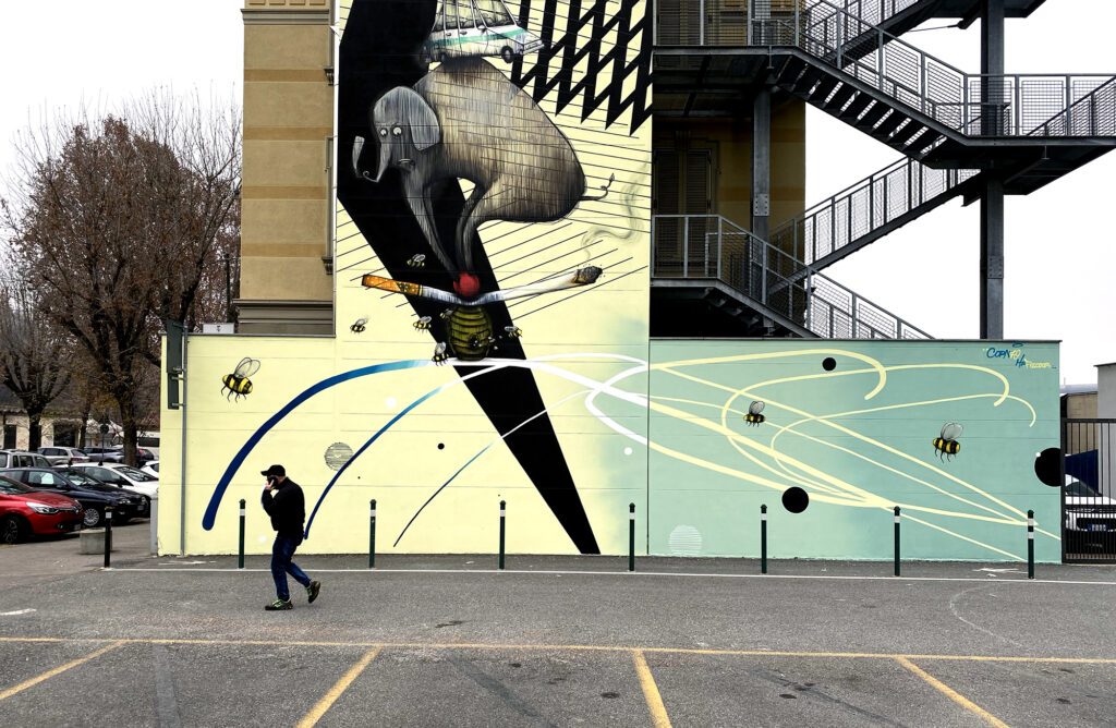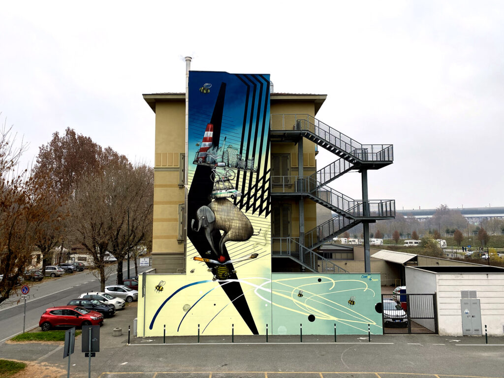 In bilico su un alveare figurano una sigaretta (simbolo del rifiuto quotidiano gettato nell’ambiente per distrazione), un elefante (animale in via di estinzione), un’automobile e una bicicletta (che rappresentano il nostro stile di vita e le scelte che noi compiamo quotidianamente); infine, una fabbrica che “schiaccia” il tutto. La fabbrica ha una doppia valenza, una concettuale perché è un elemento che deve cambiare ed evolversi, e l’altra di testimonianza a ricordo del passato industriale della zona di Parco Dora.