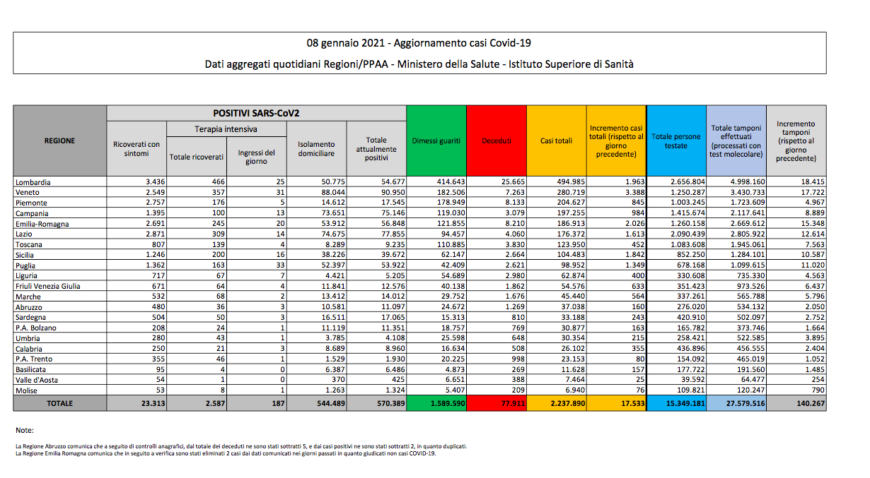 Coronavirus, Italia: il bollettino di venerdì 8 gennaio