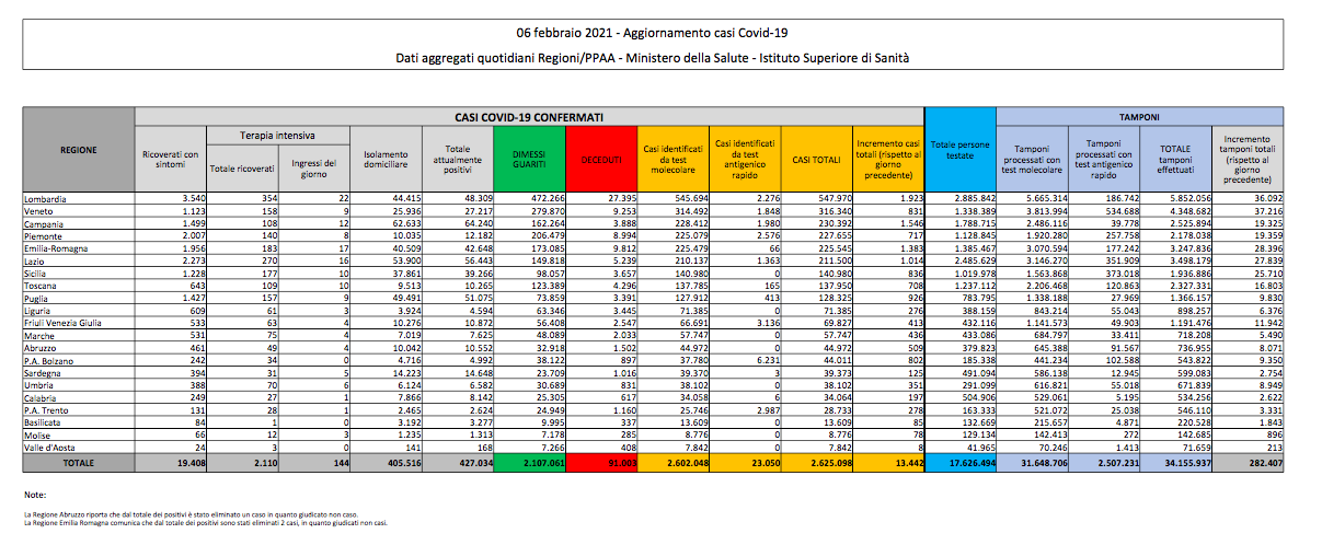 Coronavirus, Italia: il bollettino di sabato 6 febbraio