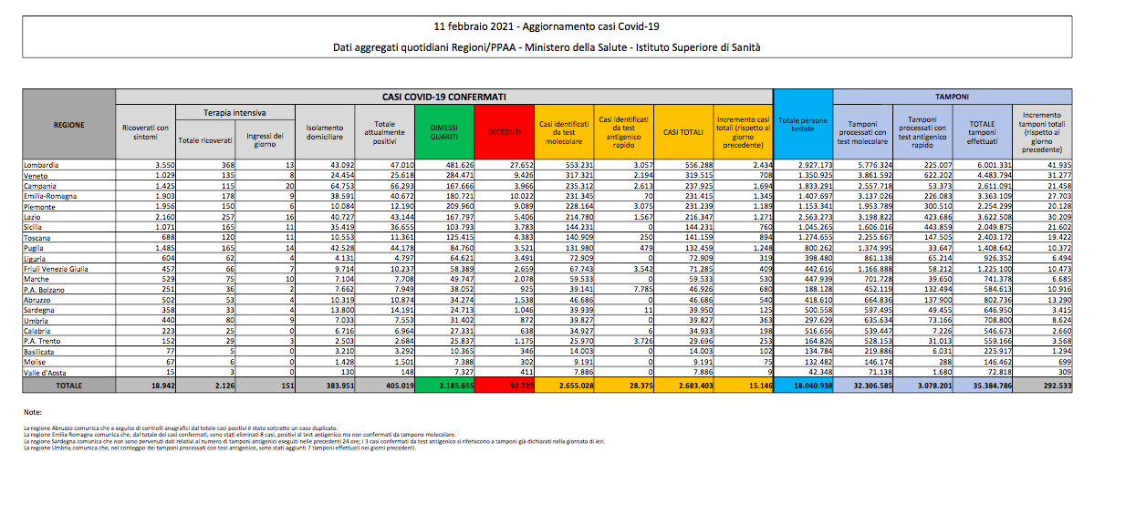 Coronavirus, Italia: il bollettino di giovedì 11 febbraio 2021