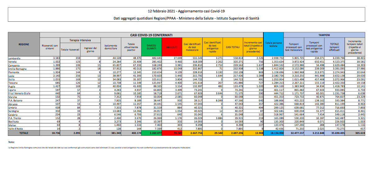 Coronavirus, Italia: il bollettino di venerdì 12 febbraio 2021