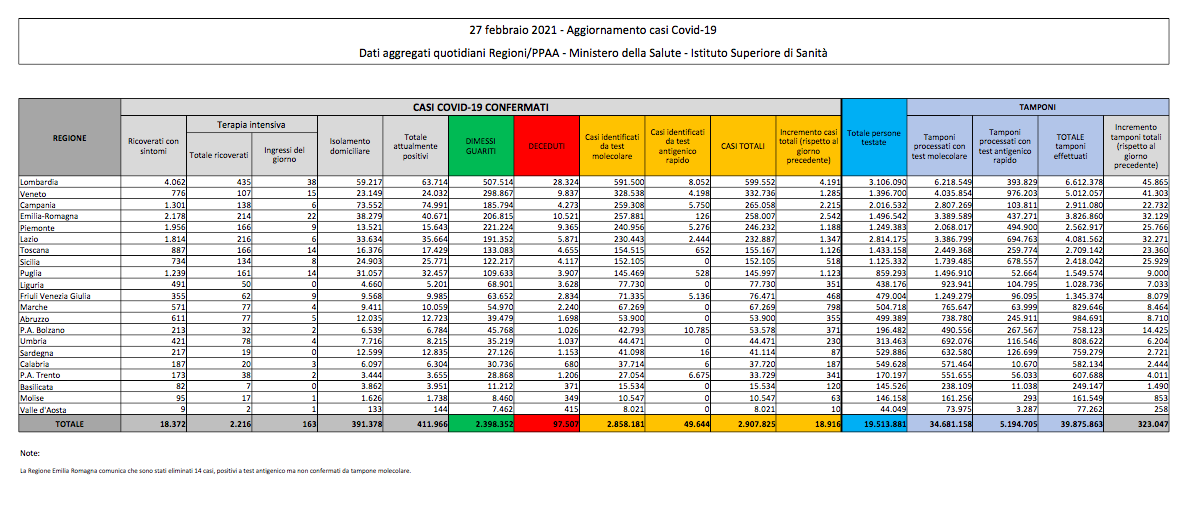 Coronavirus, Italia: il bollettino del 27 febbraio 2021