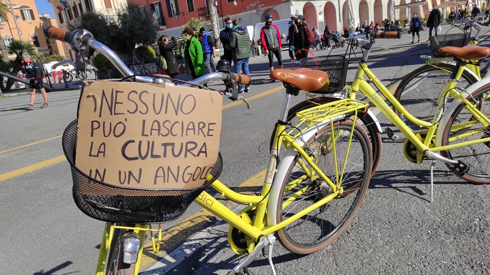 “Siamo qui per supportare l’iniziativa, per supportare amici e colleghi. La nostra protesta va avanti da un anno. E’ il momento che la cultura abbia più spazio, come lavoratori e cittadini. Siamo stufi di essere considerati invisibili. La pedalata è un gesto coraggioso, pacifico. Sanremo è una vetrina per il mondo dello spettacolo che è morto ormai da un anno”.