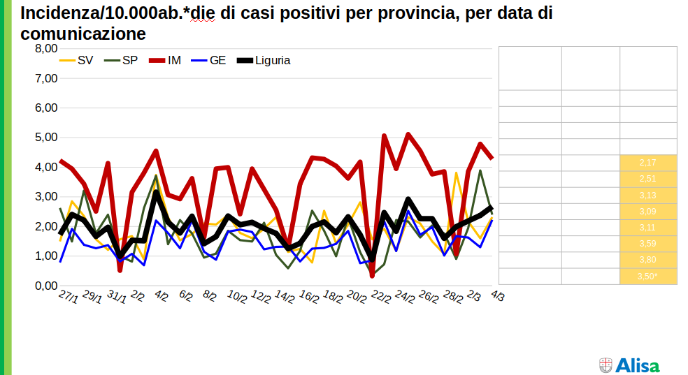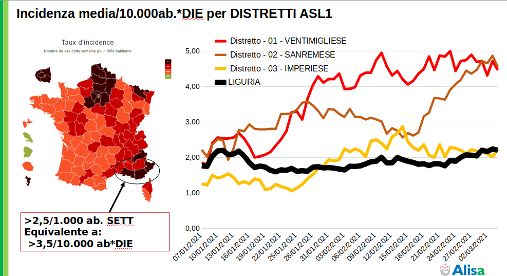 Nell’ambito della Asl 1 il quadro è variegato: il distretto di Ventimiglia soffre la vicinanza con la Francia con un tasso incidenza superiore a 4, con un aumento negli ultimi giorni dell’incidenza anche nell’area di Sanremo che ha giustificato le ordinanze emanate, l’area di Imperia invece ha un quadro paragonabile a quello delle altre province.