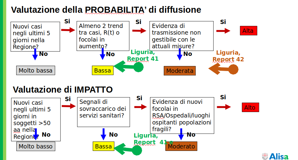 La Liguria presenta, secondo le stime, un rischio moderato che corrisponde all’area gialla. Il quadro epidemiologico non è costante e rileva un’incidenza elevata in Asl 1 dove il tasso oscilla per molte giornate tra 4 e 5 casi su 10.000, due volte e mezzo quello regionale che si traduce anche in un incremento degli ospedalizzati.