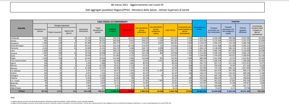 Coronavirus, Italia: il bollettino di sabato 6 marzo 2021