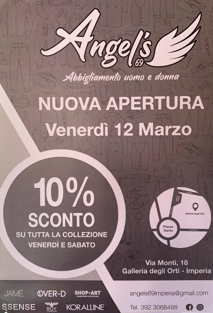 In Galleria degli Orti, nel cuore di Oneglia, venerdì 12 marzo apre Angel’s 69, il nuovo progetto firmato da Francesco Tauro, all’insegna della moda per giovani solo Made In Italy. La giornata inaugurale vedrà l’apertura con orario continuato dalle 10 alle 19 e alle 15,00 ci sarà anche un aperitivo per tutti gli ospiti, con piatti singoli, monouso, nel rispetto delle norme anti Covid 19.
