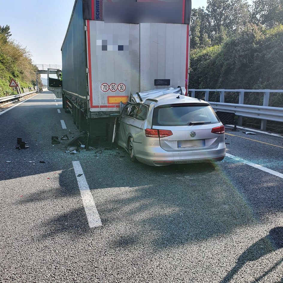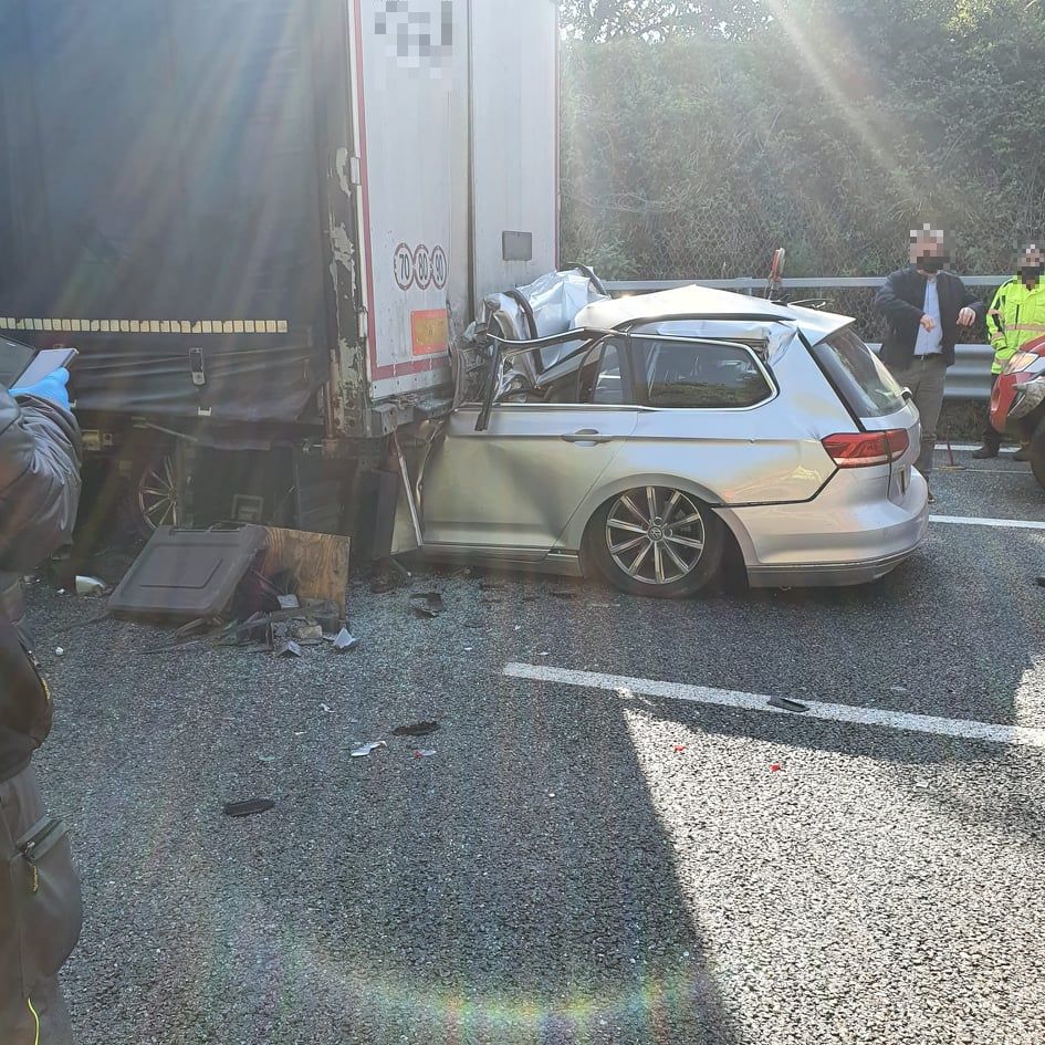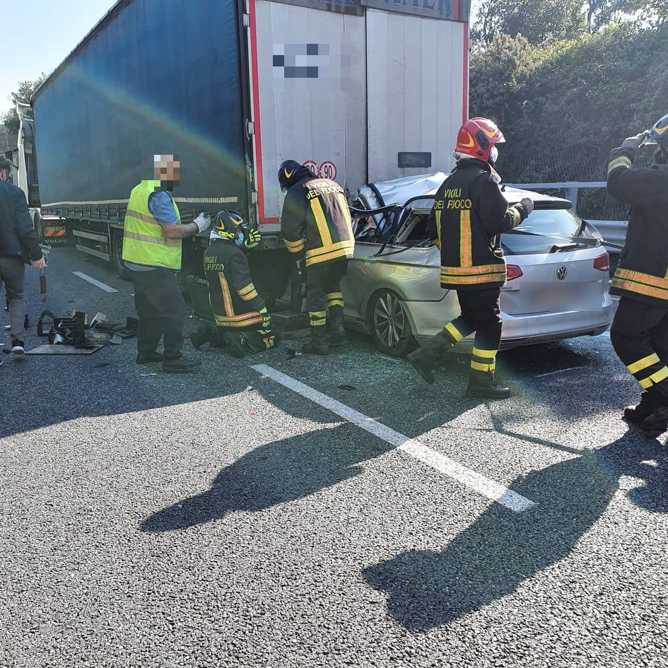 L’incidente è avvenuto in prossimità di una lunga coda. L’auto, per cause ancora in fase di ricostruzione, non è riuscita a frenare la sua corsa, scontrandosi contro il mezzo pesante fermo in coda. L’impatto è stato violentissimo e la vettura è rimasta incastrata sotto al Tir. Il conducente è deceduto e sono in corso accertamenti per verificare se a bordo dell’auto vi fossero altre persone.