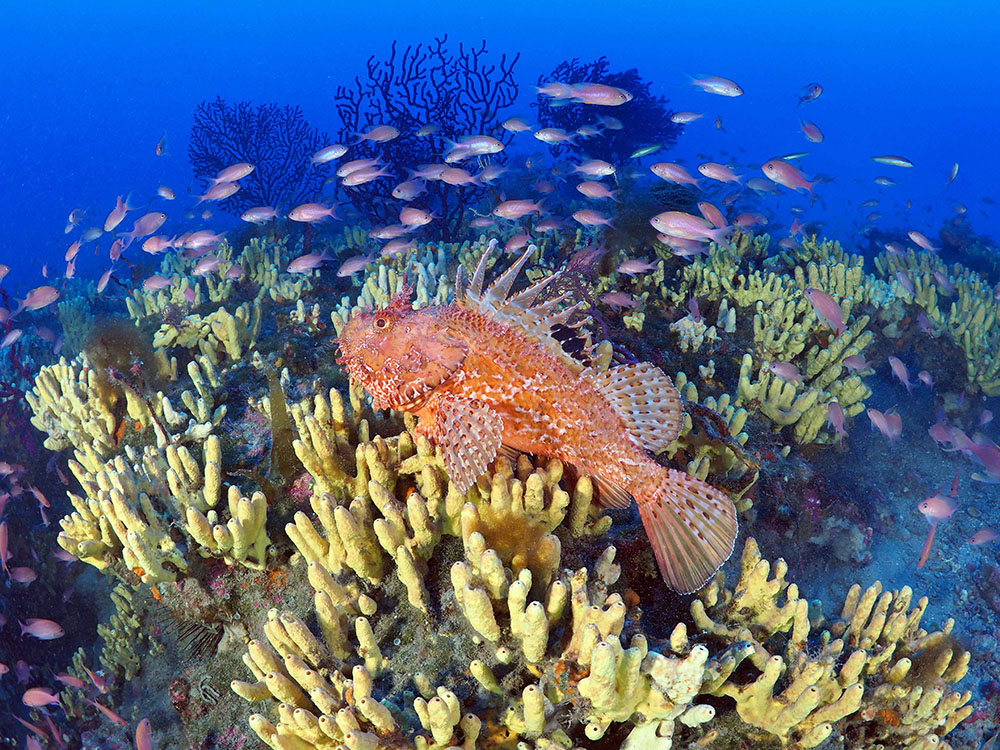 La grande prateria di Poseidonia funge da vera e propria ‘nursery’ per tantissime specie marine che qui vengono a riprodursi donando, quindi, una stagionalità all’area. Si tratta di un habitat ideale per cernie, scorfani, salpe, aragoste, seppie, calamari, spugne, rane pescatrici e pesci San Pietro, ma anche per barracuda, dentici, pesce luna, squali gattopardo attirati dall’enorme presenza di piccoli pesci e crostacei da predare.