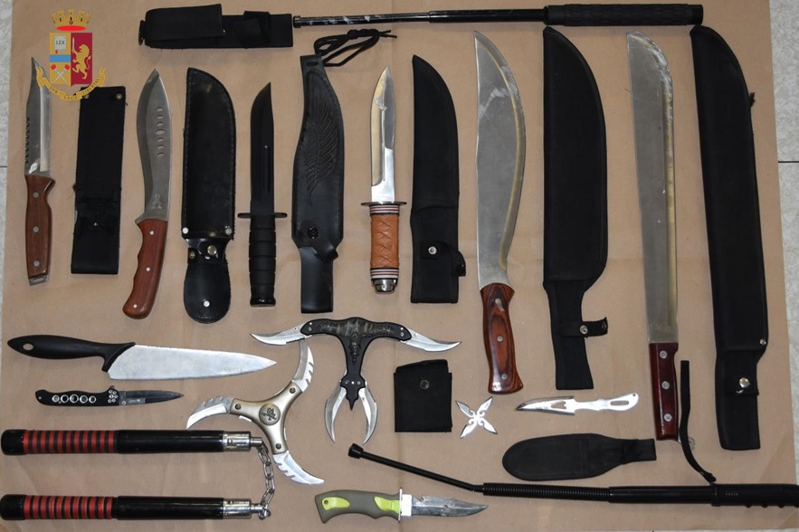 Oltre a ciò, infine, veniva rinvenuto un arsenale di armi bianche: 2 manganelli telescopici, un nunchaku, 3 machete, 2 stelle ninja e 9 tra coltelli e pugnali di diverse dimensioni.