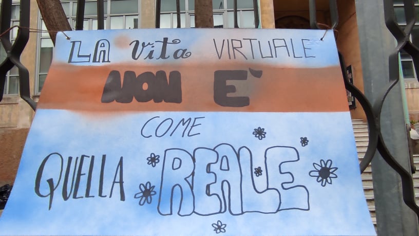 “Stiamo andando in cortocircuito”. “Siamo stanchi ridateci i banchi. “La vita virtuale non è come quella reale”. “Il futuro è un treno che si chiama scuola e passa solo adesso, dobbiamo prenderlo”.