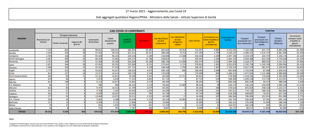 Coronavirus, Italia: il bollettino di sabato 27 marzo 2021