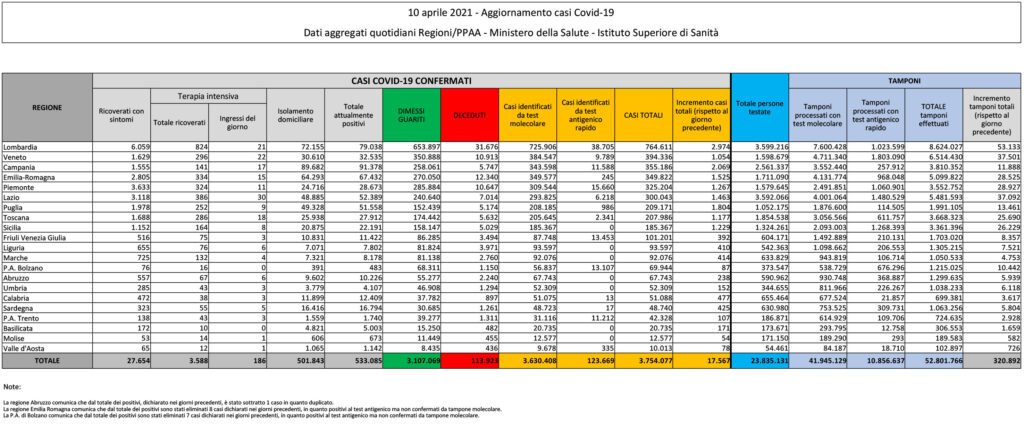 In totale i casi da inizio epidemia sono 3.754.077, i morti 113.923. Gli attualmente positivi sono 533.085 (3.276 in meno rispetto a ieri), mentre i guariti e dimessi dall’inizio della pandemia sono 3.107.069, con un incremento rispetto a ieri di 20.483.