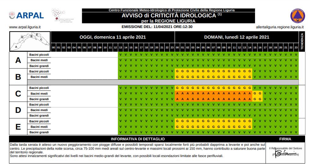 Arpal ha emanato la seguente ALLERTA METEO per gli EFFETTI DELLE PIOGGE DIFFUSE e dei TEMPORALI sul centro levante regionale dalle 00.00 alle 15.00 di domani, lunedì 12 aprile: