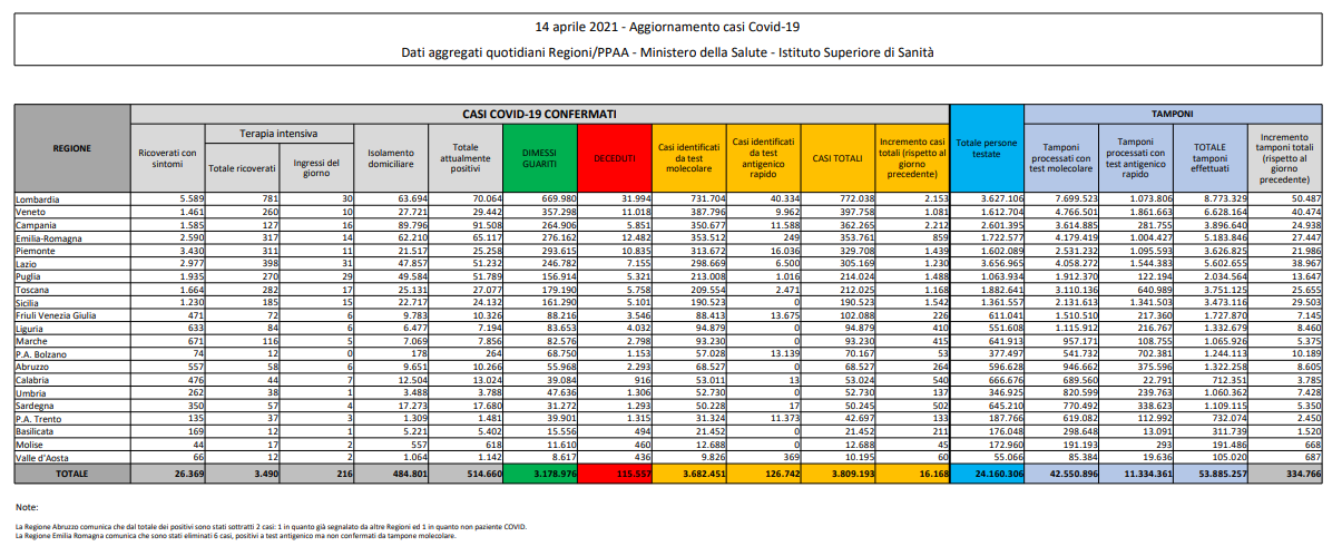 Coronavirus, Italia: il bollettino di mercoledì 14 aprile 2021