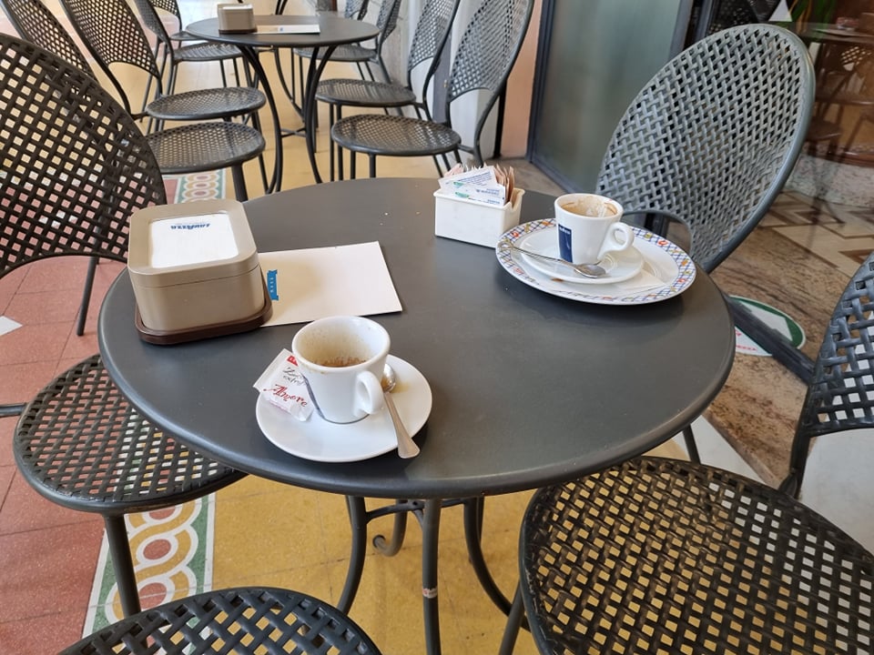 Se uno viene a prendere il caffè al banco lo posso fare, però nel cartoncino d’asporto e si può sedere fuori e consumarlo. D’altro canto c’è anche la possibilità che ti siedi fuori, chiedi un caffè e te lo porto nella ceramica.
