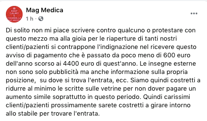 Scrivono i responsabili di Mag Medica: “Di solito non mi piace scrivere contro qualcuno o protestare con questo mezzo ma alla gioia per le riaperture di tanti nostri clienti/pazienti si contrappone l’indignazione nel ricevere questo avviso di pagamento che è passato da poco meno di 600 euro dell’anno scorso ai 4.400 euro di quest’anno.