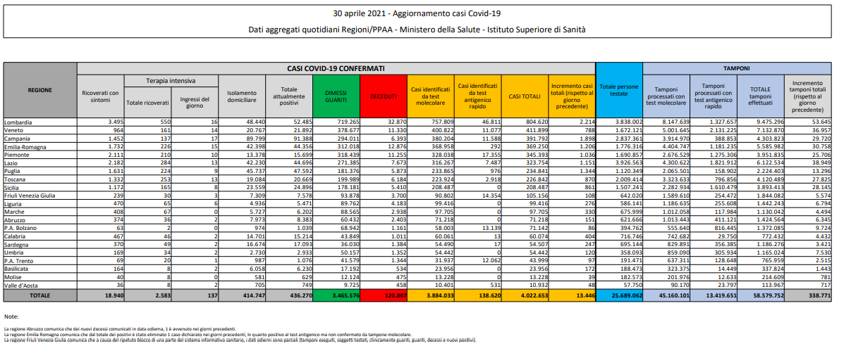 Coronavirus, Italia: il bollettino di venerdì 30 aprile 2021