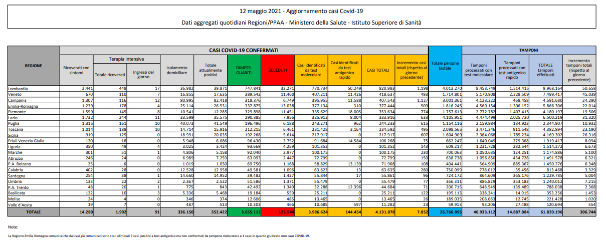 Coronavirus, Italia: il bollettino di mercoledì 12 maggio 2021