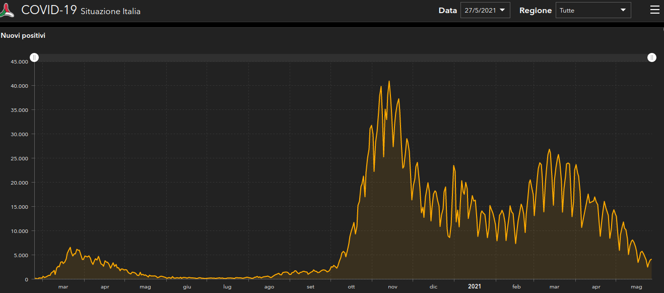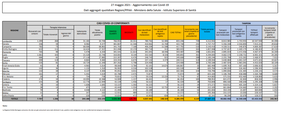Coronavirus, Italia: il bollettino di giovedì 27 maggio 2021