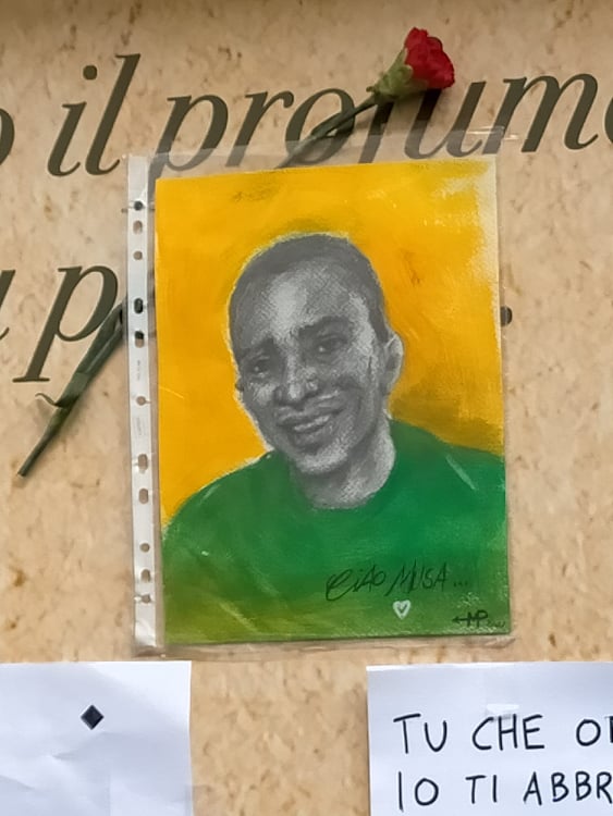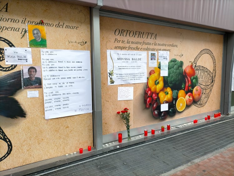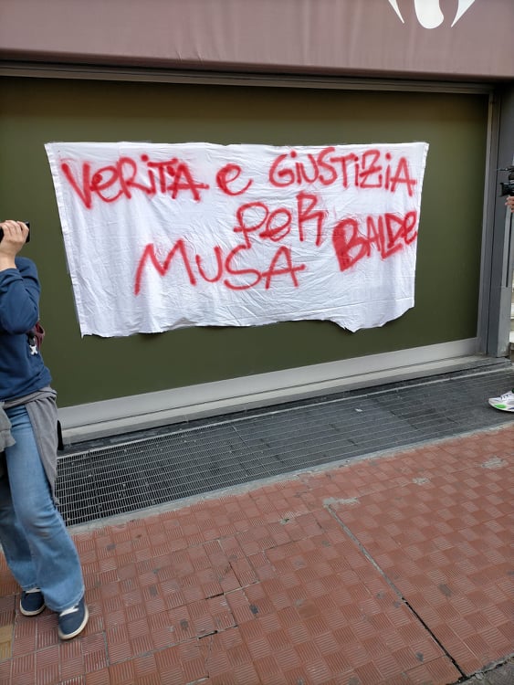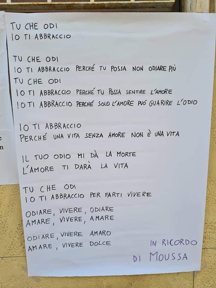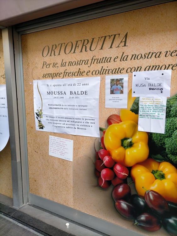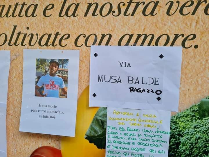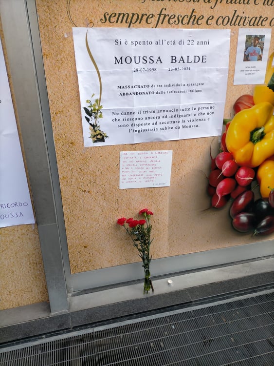 Su uno dei cartelli si legge: “Si è spento all’età di 22 anni Moussa Balde, massacrato da tre individui a sprangate, dimenticato dalle istituzioni. Ne danno il triste annuncio tutte le persone che riescono ancora a indignarsi e che non sono disposte ad accettare la violenza e l’ingiustizia subite da Moussa”.