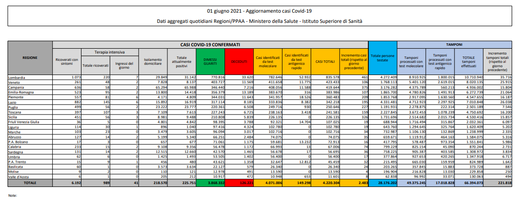 Coronavirus, Italia: il bollettino di martedì 1 giugno 2021