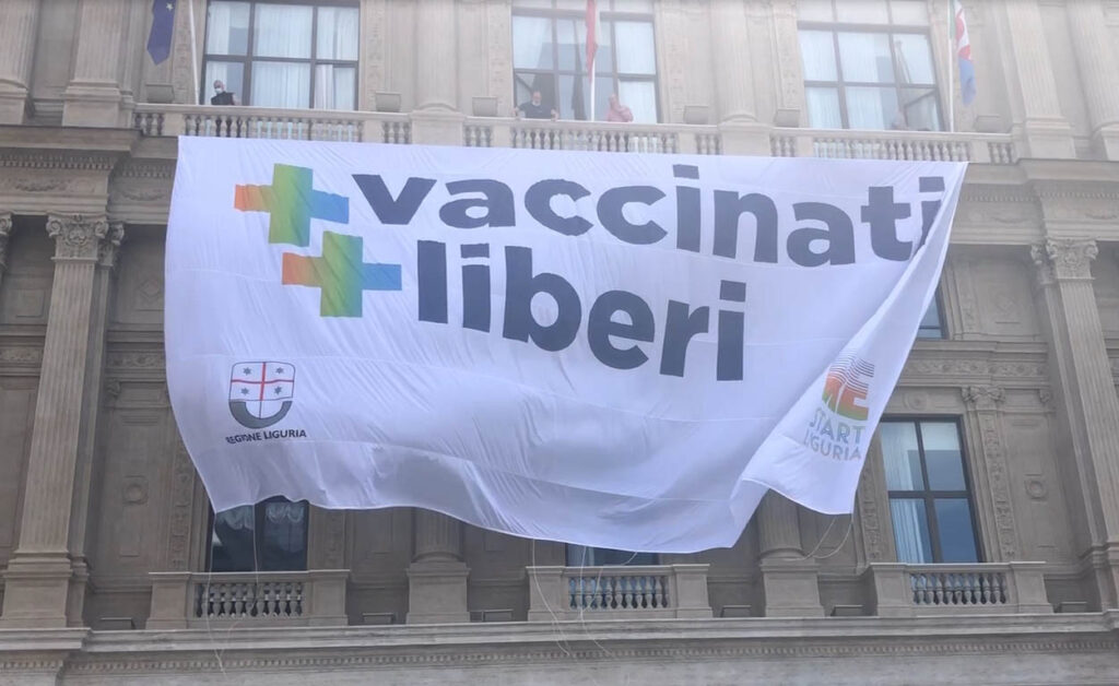 Prende il via oggi a Genova, nella giornata della Festa della Repubblica, la campagna ‘Vaccinati e Liberi’ per la ripartenza in sicurezza della Liguria, accompagnata dalle magliette ‘Adulto e vaccinato’, ideate da tre ragazzi genovesi durante la pandemia e indossate dal presidente della Regione Giovanni Toti e dal testimonial dell’iniziativa Matteo Bassetti, direttore della Clinica di Malattie Infettive dell’Ospedale Policlinico San Martino. Sulla facciata del Palazzo della Regione di Piazza De Ferrari è stato srotolato uno striscione con scritto ‘Vaccinati e Liberi’ che rimarrà esposto fino al 7 giugno. Obiettivo dell’iniziativa, sensibilizzare i cittadini, soprattutto quelli ancora scettici, sull’importanza della vaccinazione per sconfiggere definitivamente il Covid-19.