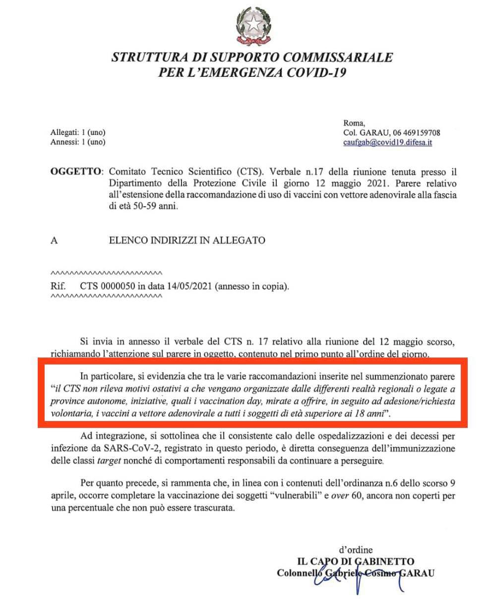 “Il CTS non rileva motivi ostativi a che vengano organizzate dalle differenti realtà regionali iniziative, quali i vaccination day, mirate a offrire, in seguito ad adesione/richiesta volontaria, i vaccini a vettore adenovirale a tutti i soggetti di età superiore ai 18 anni” si legge nella lettera.