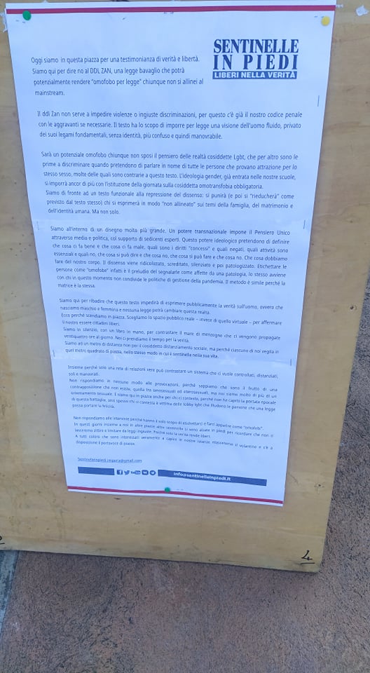 Come ormai nella tradizione, le Sentinelle in Piedi sono rimaste in silenzio, con un libro in mano, mentre uno degli attivisti, a turno, leggeva un documento per spiegare i motivi della protesta.