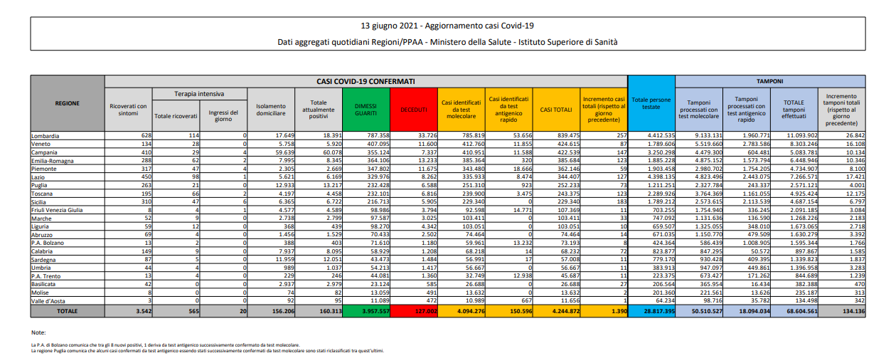 Coronavirus, Italia: il bollettino di domenica 13 giugno 2021