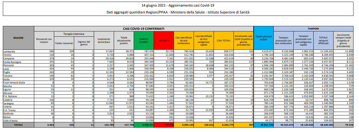 Coronavirus, Italia: il bollettino di lunedì 14 giugno 2021