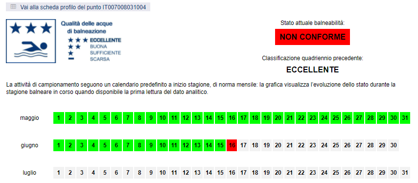 Tratto di mare classificato come “eccellente” come qualità delle acque. “La classificazione di un’acqua di balneazione – si legge sul sito Arpal – è un giudizio del tratto di costa indipendente dal fatto che in quel momento sia balneabile o meno: viene calcolato sulla base di un set di dati ‘storici’ (tipicamente gli ultimi quattro anni) e resta invariato per tutta la stagione balneare corrente. Al termine di ogni stagione balneare, la classificazione viene ricalcolata e deliberata, entro il 30 novembre di ogni anno, da Regione Liguria”.
