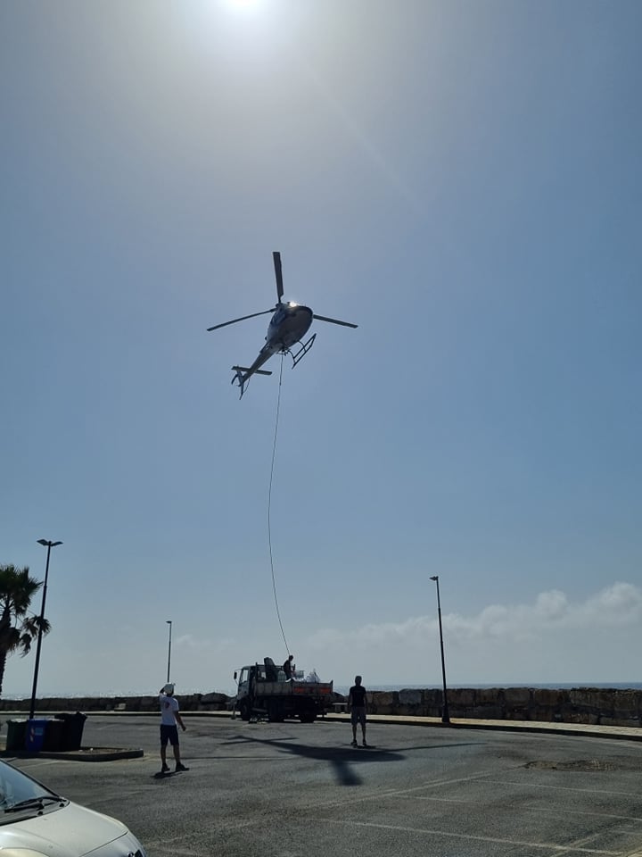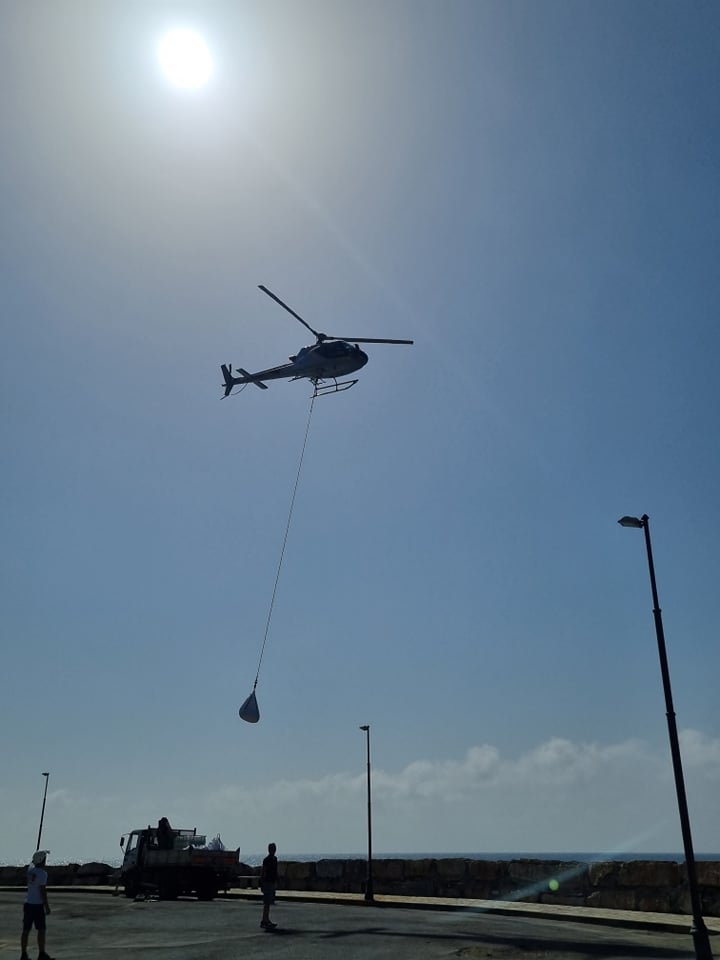 Nella giornata di oggi, l’elicottero ha rifornito il cantiere trasportando sacchi pieni di pietre recuperate nei dintorni della torre, crollate negli anni per via della forza del mare e del vento, e altri materiali necessari alla riparazione della torre. In particolare, il velivolo ha effettuato circa una decina di viaggi dal parcheggio di Borgo Prino alla Torre, tenendo gli occhi dei presenti incollati sull’operazione.