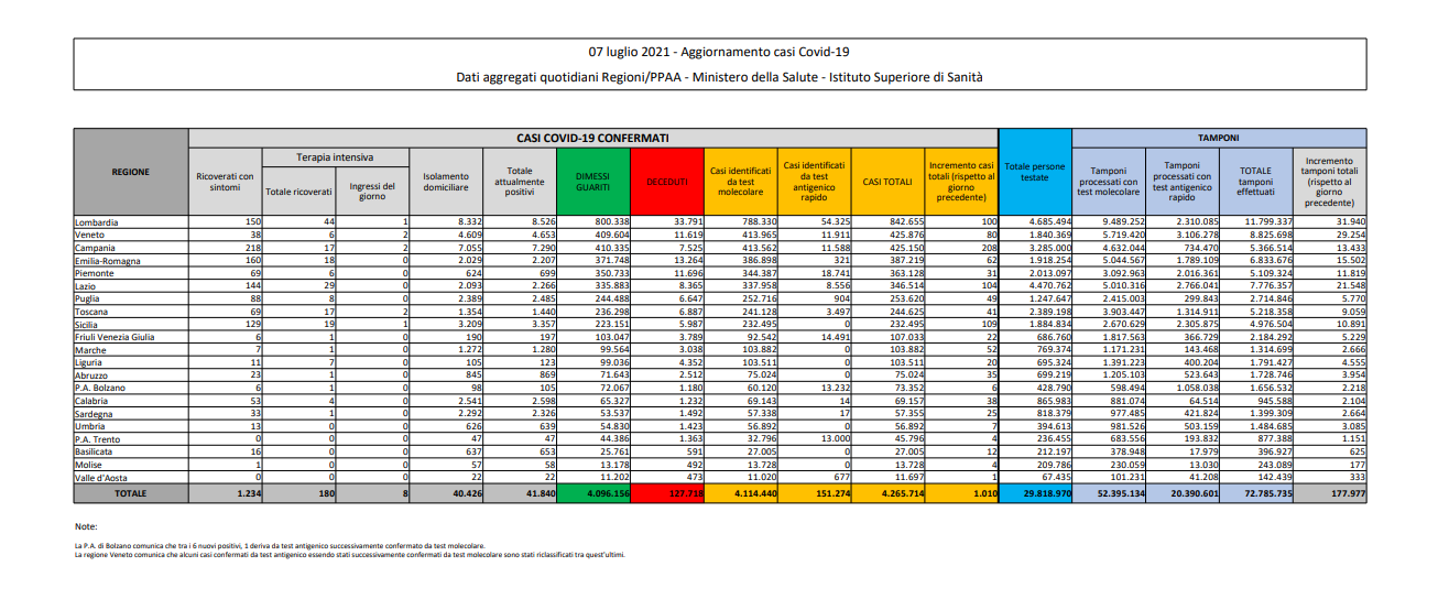 Coronavirus, Italia: il bollettino di mercoledì 7 luglio