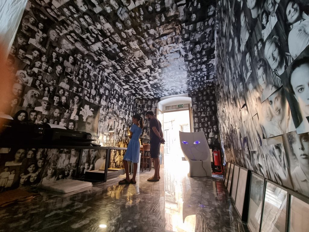 Chi supera la timidezza entra in bottega e si trova immerso in un mare di volti che rivestono le pareti, il soffitto e il pavimento. Sono i volti delle persone che hanno scelto di posare qui per Settimio Benedusi. Da soli, con la propria metà, i figli o l’inseparabile amico a quattro zampe. Ognuno con la sua unicità, impossibile da replicare, perchè si è già diversi l’istante successivo.