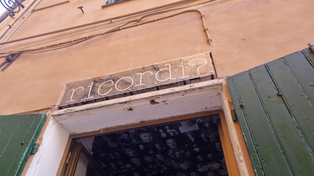 Un portone verde, una panchina rossa e una grande insegna luminosa: “Ricordi?”. Musica leggera da un giradischi, scorci di fotografie.
