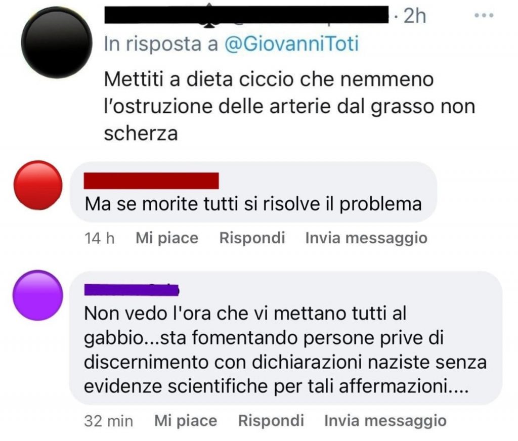 “Nazista, vuoi imporre dittatura sanitaria”. “Se morite tutti si risolve il problema”. “Manchi solo tu all’appello, magari ti ricoverano subito”. “Attento a minacciare, saremo la tua Norimberga”.