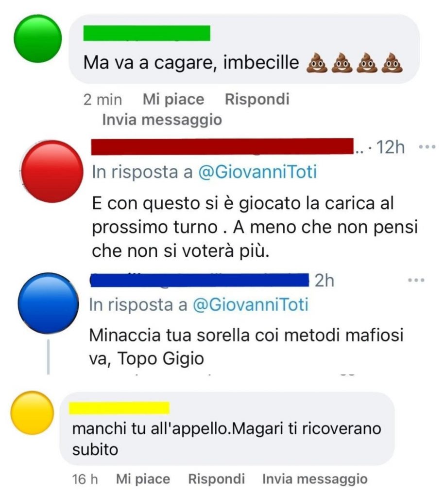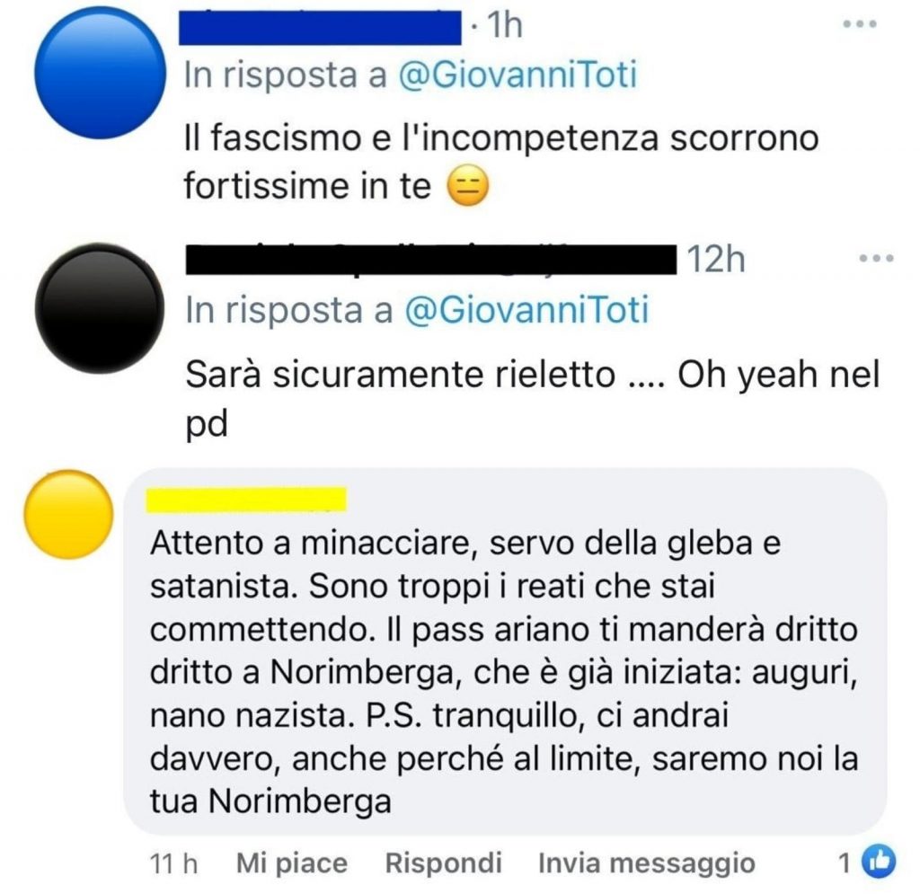 Questi e molti altri sono i messaggi di minacce e insulti che, nelle ultime ore, stanno riempiendo la bacheca Facebook del Presidente della Regione Liguria Giovanni Toti, dopo il suo chiaro appoggio all’utilizzo del green pass in molteplici situazioni, contestando il fatto che viene limitata la libertà di chi non vuole vaccinarsi contro il Covid.