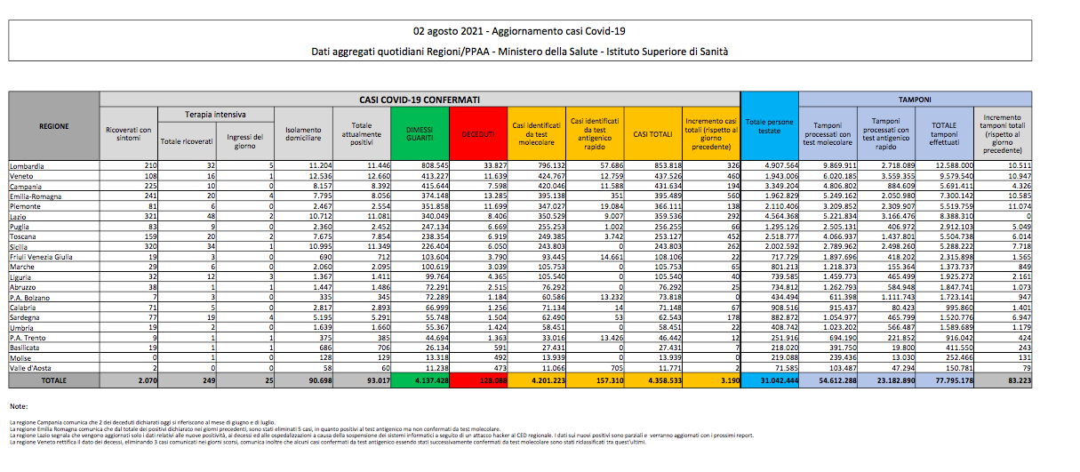 Covid, Italia: il bollettino di lunedì 2 agosto
