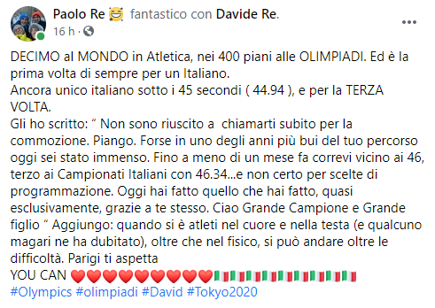 “Oggi hai fatto quello che hai fatto, quasi esclusivamente, grazie a te stesso. Ciao Grande Campione e Grande figlio”. Così Paolo Re ha raccontato, con un post sul proprio profilo Facebook, i momenti di commozione per la partecipazione del figlio Davide alle Olimpiadi di Tokyo. Il 28enne imperiese ha raggiunto le semifinali nei 400 metri piani, la prima volta per un italiano, scendendo sotto i 45 secondi.