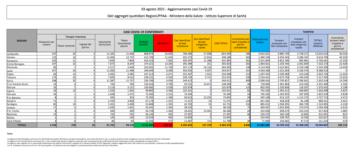- dimessi / guariti 4.141.043 (+ 3.615)