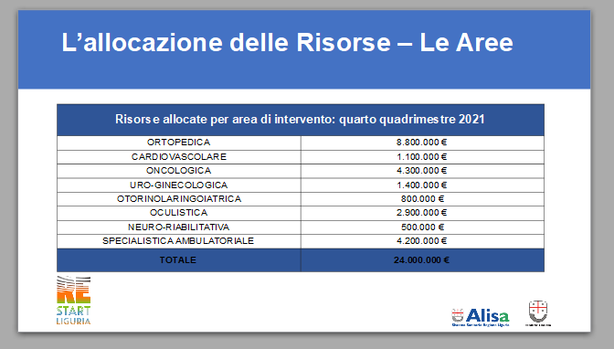 “Queste risorse – aggiunge il presidente della Regione Liguria – serviranno per riorganizzazione e potenziamenti strutturali, con l’obiettivo di individuare una serie di centri specialistici che si concentreranno su determinate attività e, in questo modo, prima riassorbire le liste di attesa e, in futuro, cambiare il segno del saldo della mobilità da negativo a positivo”.