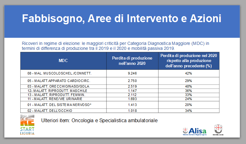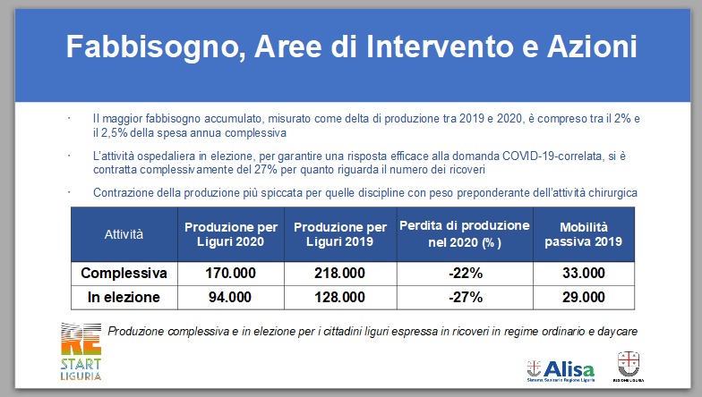 La riorganizzazione delle realtà ospedaliere per far fronte alla fase più acuta della pandemia ha impattato in particolare sulle attività chirurgiche e ambulatoriali, con conseguenze più significative per i pazienti con patologie cardiovascolari, oncologiche, ortopediche: “Si tratta – prosegue Toti – delle aree più penalizzate dal Covid, che saranno quindi le prime su cui andremo a intervenire. Il piano Restart Sanità vuole dare ai cittadini liguri una risposta concreta, concentrandosi innanzitutto su quelle persone che, per le patologie di cui soffrono, sono state più penalizzate dalla pandemia”.