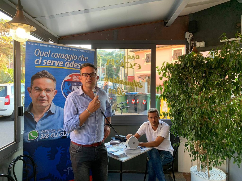 Francesco Parrella, candidato Sindaco a Diano Marina per le elezioni del prossimo 3–4 ottobre, ha iniziato una serie di aperitivi per incontrare la cittadinanza. Parrella, comandante della Polizia Municipale di Alassio (lo è stato anche nella città degli aranci) è sostenuto dalla lista “Diano Domani” che unisce forze politiche che vanno dall’estrema sinistra, con Rifondazione, sino al centrodestra, con il movimento Diano Cambia, che fa capo a Roberto Manduca e Roberto Ardissone, dal Partito Democratico a Diano Riparte, che fa capo all’ex Sindaco Angelo Basso.