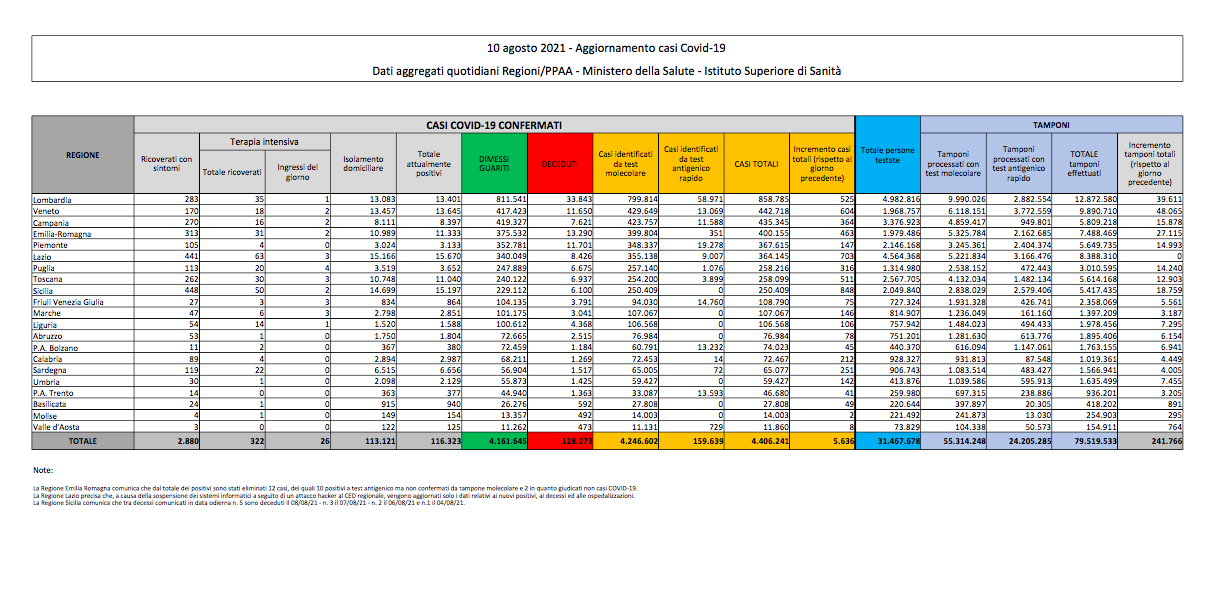 Covid, Italia: il bollettino di martedì 10 agosto 2021