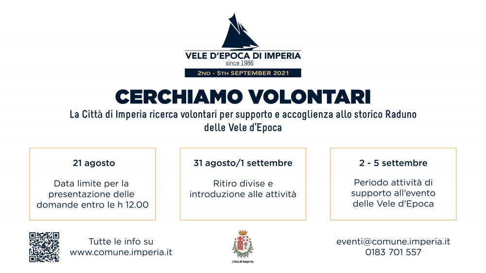 Nel dettaglio, l’avviso ricerca 20 volontari, 10 femmine e 10 maschi, “interessati a svolgere diverse attività di supporto in occasione del Raduno delle Vele d’epoca di Imperia che si svolgerà ad Imperia – Calata Anselmi – dal 2 al 5 settembre 2021”.
