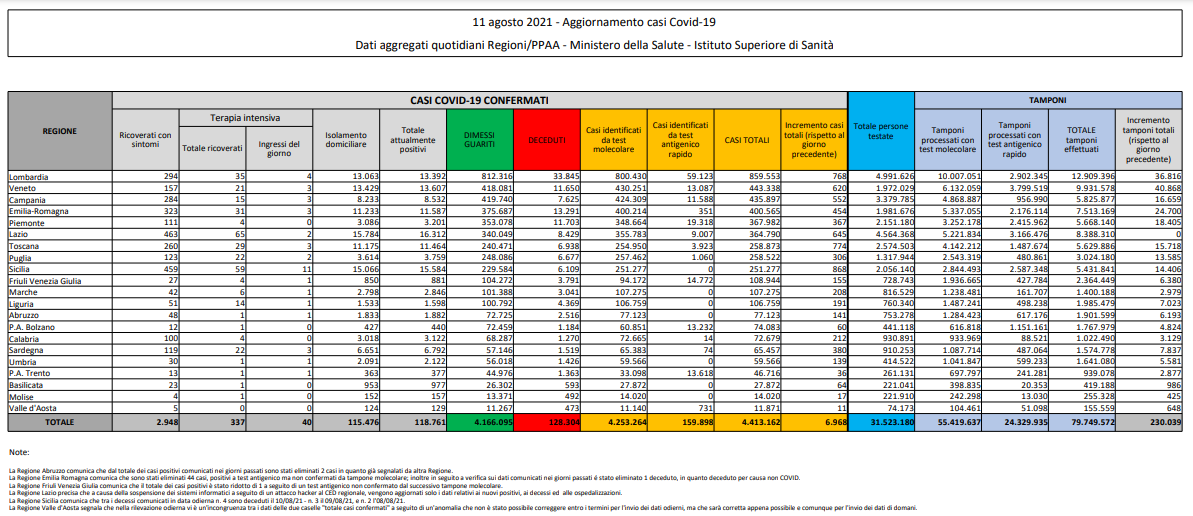 Covid, Italia: il bollettino di mercoledì 11 agosto 2021