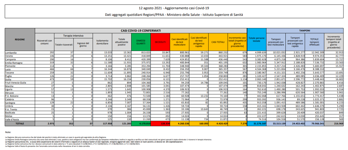 Covid, Italia: il bollettino di giovedì 12 agosto 2021