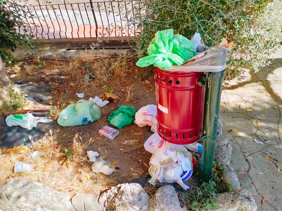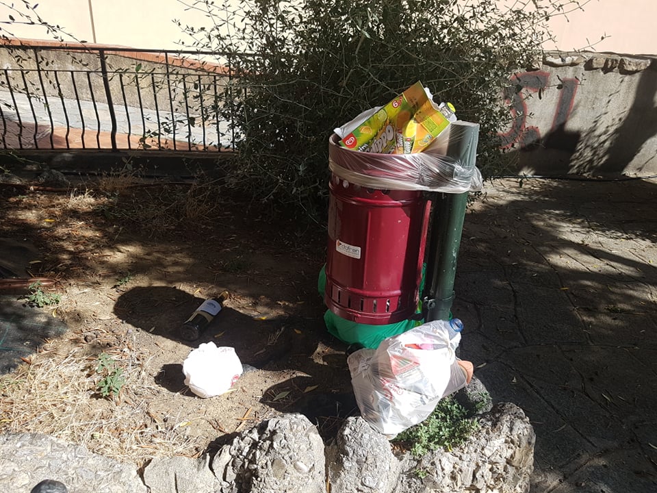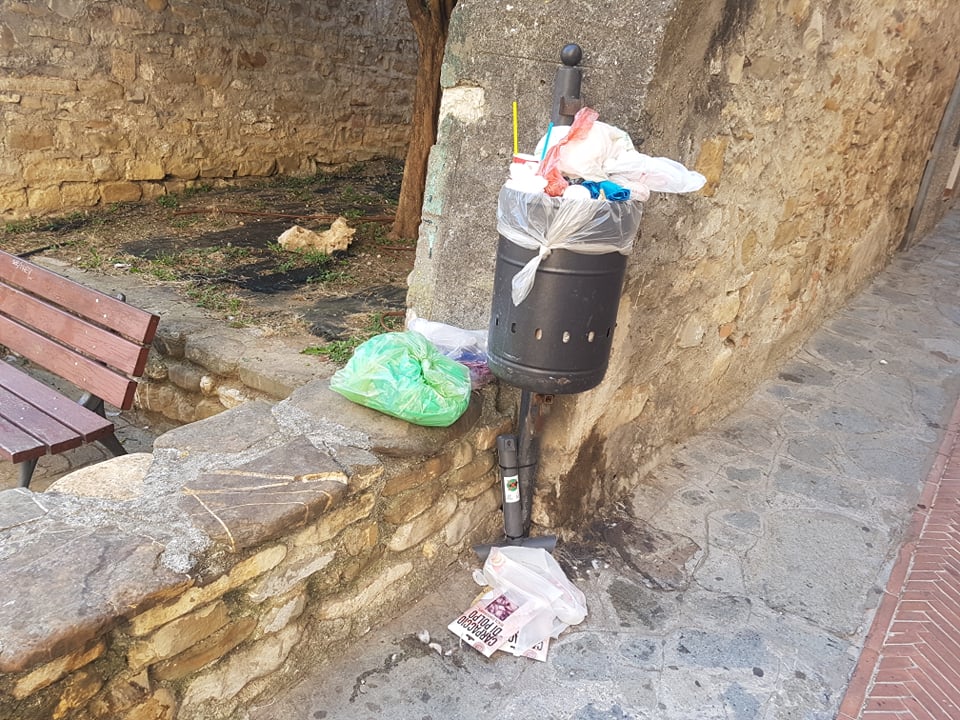 Cestini strabordanti di rifiuti, cartacce e bottiglie di vetro e di plastica gettate a terra e nella aiuole. Così si presenta oggi la piazzetta di via Fossi, la prima che si incontra partendo da piazza Duomo per inoltrarsi nel suggestivo borgo Parasio, proprio a due passi dalla bottega del fotografo Settimio Benedusi, promotore di messaggi contro l’inciviltà.